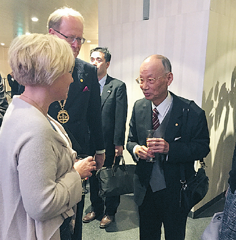 Satoshi Omura hälsar på minister Helene Hellemark Knutsson från utbildningsdepartementet. Foto: Liv Beckström