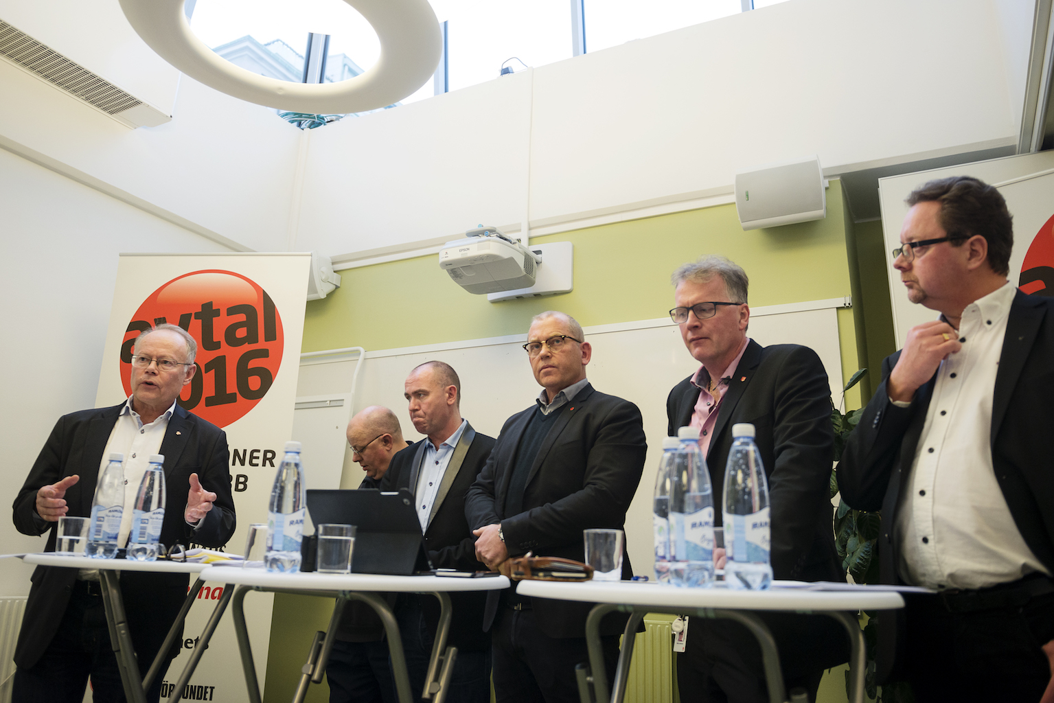 6F kallade till gemensam presskonferens om sina gemensamma avtalskrav. Från vänster: Janne Rudén (Sekos ordförande), Christer Persson (ekonom), Jonas Wallin (Elektrikernas förbund), Johan Lindholm (Byggnads ordförande), Mikael Johansson (Målareförbundets ordförande) och Magnus Pettersson (Fastighets ordförande). Arbetsgivarnas högljudda protester tog man med ro. – Vi har hittills aldrig varit med om att de har legat högre än oss vid ingången av en avtalsrörelse, konstaterade Mikael Johansson, ordförande för Målarna. Foto: Vilhelm Stokstad/ TT.