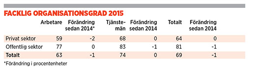 Tjänstemännen håller däremot ställningarna med 74 procent fackligt anslutna både 2014 och 2015. Organisationsgraden är numera betydligt högre än arbetarnas.
