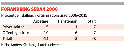 Professor Anders Kjellberg vid sociologiska institutionen på Lunds universitet visar nu också att organisationsgraden för arbetare fortsatte att sjunka under 2015.