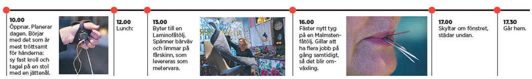 Hon klär om släktklenoder som folk lämnar in, men arbetar också åt företag. Det kan röra sig om att klä om 800 stolssitsar till en aula – ”hela familjen var engagerad, man betade av en säck sitsar och sedan fick man bryta av med att göra något annat en stund” – eller om tempojobb med soffor och gardiner på Finlandsbåtarna – ”man rusar ombord, superjobbar så länge båten ligger i hamn, rusar av precis innan avgång”.