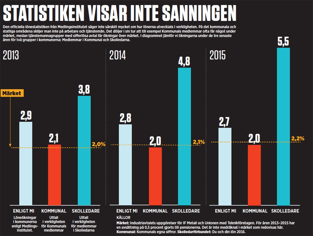 Skolledarna lyfter fram 5 procent i löneökningar som de lyckats få ut tre år i rad. De som verkar ha fått betala för deras ökningar är Kommunals medlemmar, men i den hopslagna gröten till statistik syns det inte.