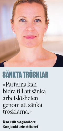 – Vår bedömning är att särskilt grupper med svagare arbetsmarknadsanknytning påverkas av höjda lägstalöner. Parterna kan bidra till att sänka arbetslösheten genom att sänka trösklarna. På kort sikt skulle en sänkning av lägstalöner-na främst öka sysselsättningschanserna för dem som står nära arbetsmarknaden, fortsätter hon.
