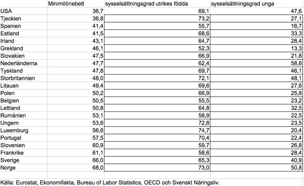 Han har sammanställt statistik över sysselsättningen bland unga och utrikesfödda i 22 industrialiserade länder och ställt dessa siffror i relation till hur hög lägstalönen är i respektive land. Om höga lägstalöner leder till lägre sysselsättning skulle länderna placera sig längs en nedåtlutande linje, hävdar SEKO-utredaren.