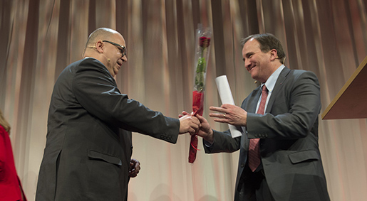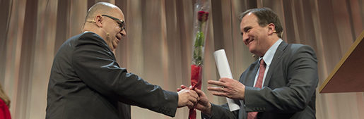 STOCKHOLM 20131206 Socialdemokraternas ordfˆrande Stefan Lˆfven tackas av LO-ordfˆranden Karl-Petter Thorwaldsson efter ett tal vid LO:s valkonferens i Stockholm p torsdagen. Foto: Fredrik Sandberg / TT / Kod 10080