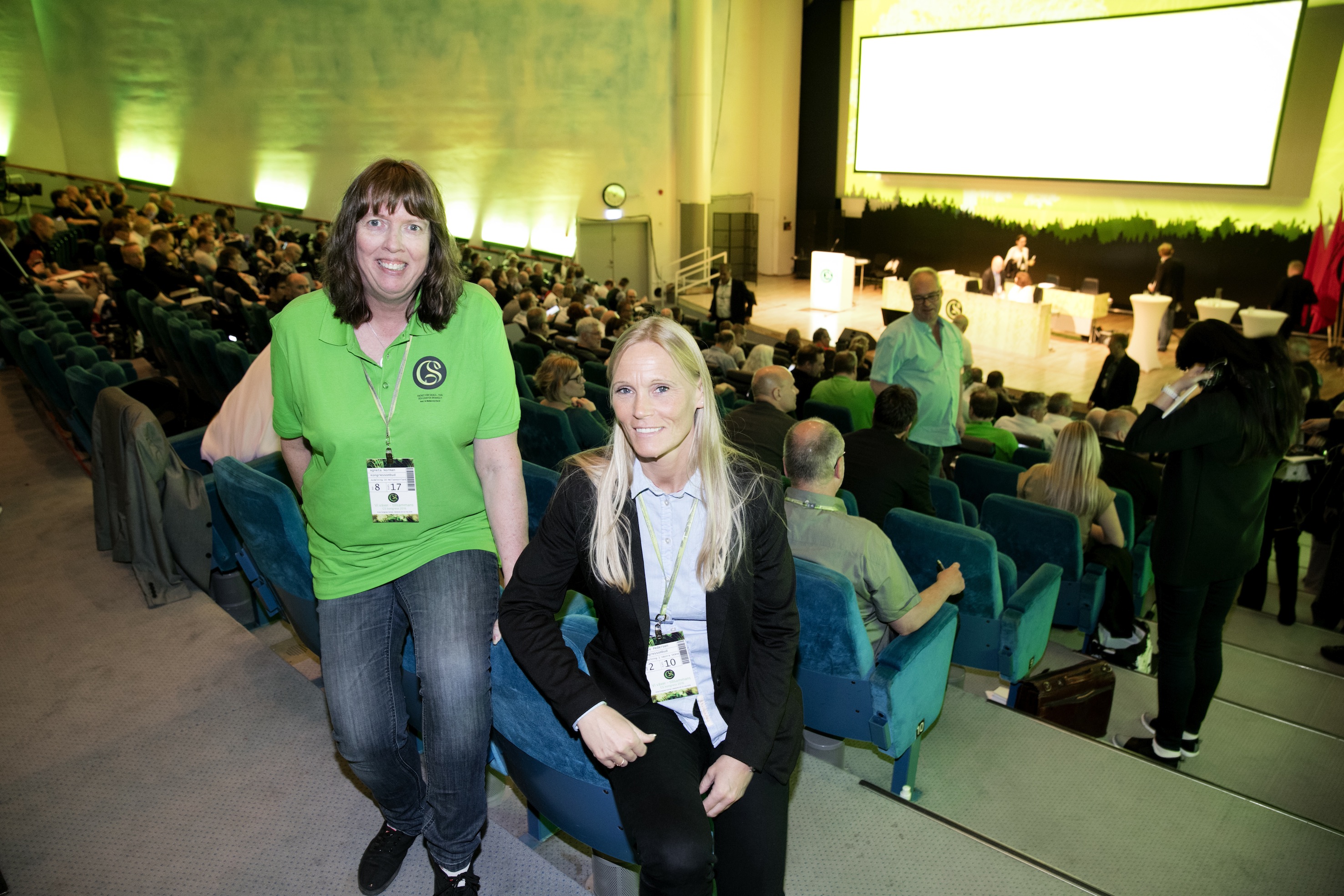 Från vänster Agneta Norman och Marie Pedersen på fackförbundet GS, Facket för Skogs-Trä- & Grafisk Bransch, som håller kongress i Västerås. Foto: Per Groth