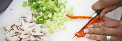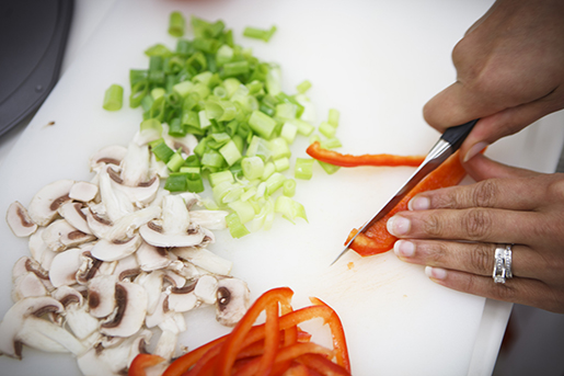 Lockeed Martin senior research scientist Maya Cooper chops vegetables, which would be feasable for astronauts in Mars gravity, for a vegan pizza developed at NASA's Advanced Food Technology Project at Johnson Space Center in Houston Tuesday, July 3, 2012. NASA is currently planning a mission to Mars, which has gravity, so more options for food preparation, like chopping vegetables, are available as opposed to the dehydrated fare of current space missions. (AP Photo/Michael Stravato)