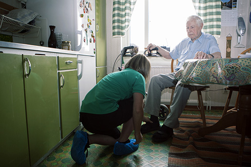 Kamilla Sjödin besöker Arne Nordin och hjälper honom med skorna inför besök hos vårdcentralen. Foto: Mats Andersson / TT