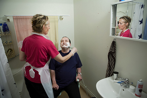 Krister Hådén har en hjärnskada och har haft hemtjänst i åtta år. Han behöver hjälp med maten, medicinen och tvätten. I dag ska han rakas.