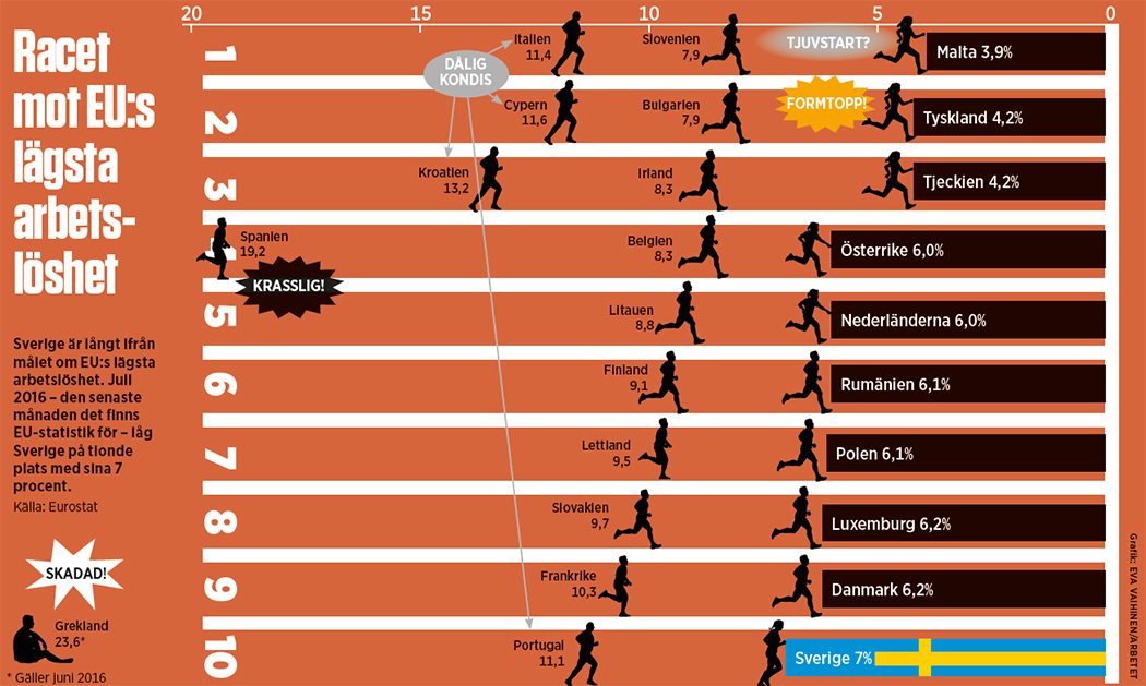 Kanske ångrar Stefan Löfven att han inte valde ett sådant mål. Sett till sysselsättningsgraden, alltså hur stor andel av befolkningen i arbetsför ålder som jobbar, är Sverige bäst i EU med strax över 80 procent. I stället ligger Sverige nu på tiondeplats – utklassat av Malta, som har lägre arbetslöshet, men en sysselsättningsgrad på bara 67,8 procent 2015.