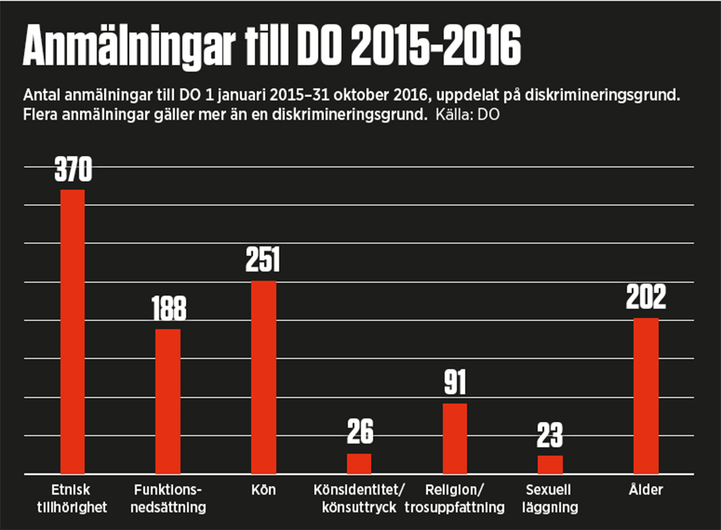 • DO har stämt i åtta fall. Den vanligaste orsaken är sexuella trakasserier. Men även diskriminering för etnicitet, funktionsnedsättning, sexuell läggning och kön finns med.
