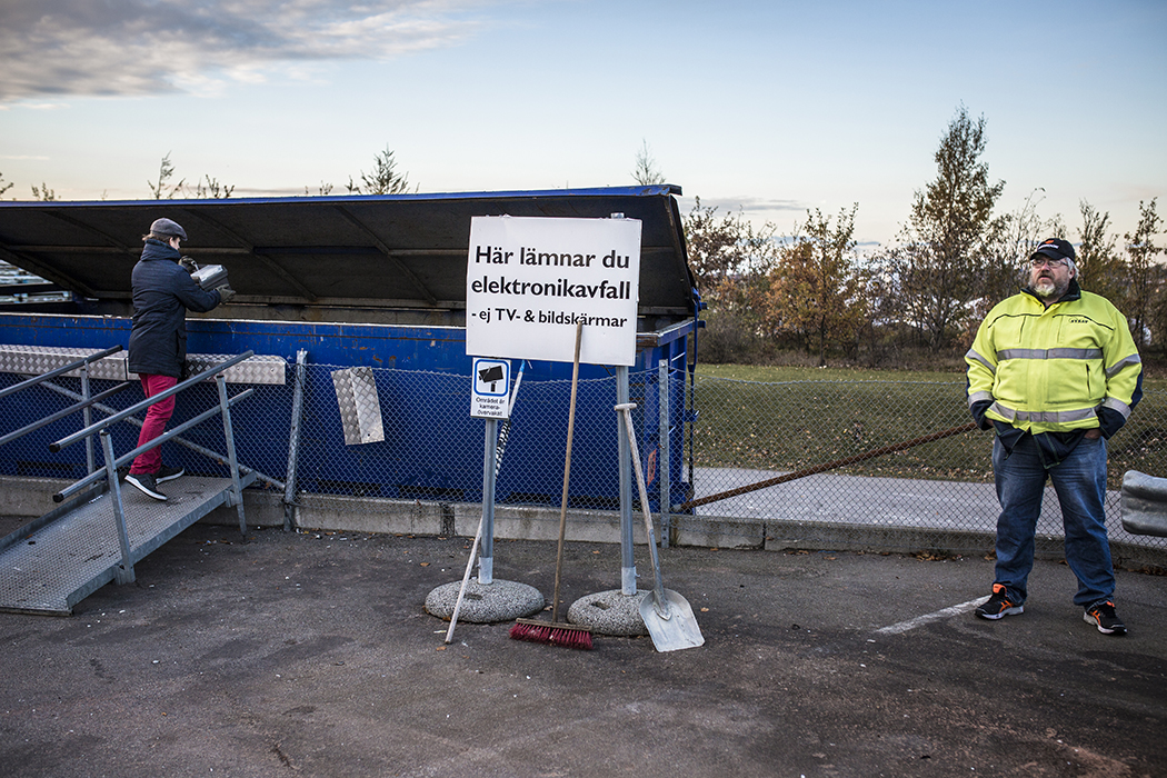 Henrik Stridh, Kommunals huvudskyddsombud, vid stationen för elektronikavfall, där det mest stöldbegärliga godset ligger. En del av personalen vägrar stå vid stationen, på grund av de många hotfulla incidenterna. Foto: Jesper Klemedsson