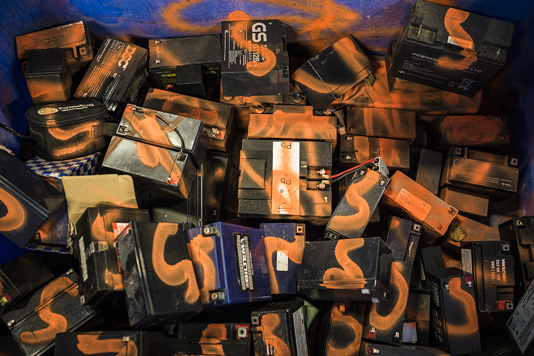 Inlämnade bilbatterier och datorer sprayas orange för att det ska synas att de kommer från återvinningen, om tjuvar försöker sälja dem. Foto: Jesper Klemedsson