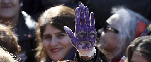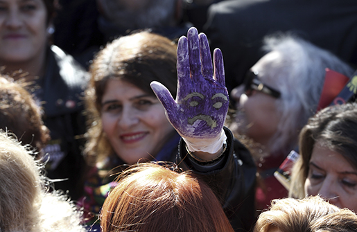 A woman shows her hand painted to represent a child's face, as thousands of members of Turkey's main opposition Republican People's Party march to the parliament in Ankara, Turkey, Tuesday, Nov. 22, 2016. Following a public outcry, Turkey's government has withdrawn a proposal that critics said would have allowed men accused of sexually abusing underage girls to go free if they were married to their victims. (AP Photo/Burhan Ozbilici)