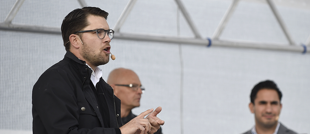 BROM÷LLA 20160930 SD:s partiledare Jimmie ≈kesson (p bilden) och civilminister Ardalan Shekarabi (S) debatterar om lagfˆrslaget i offentliga upphandlingar i Bromˆlla Foto: Bjˆrn Lindgren / TT kod 9290