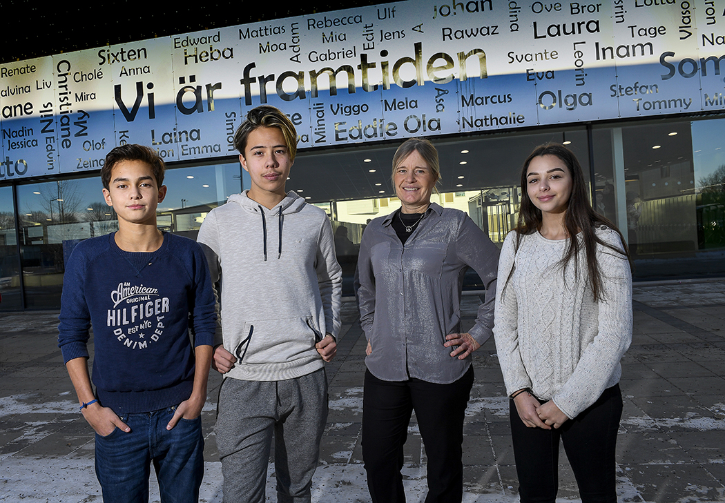 För två år sedan slogs kommunens fyra högstadier ihop. Jonathan Larsen, Liam Ståhl, läraren Tina Blad Sigfridsson och Juliana Mouhadam gillar den nya skolan. Foto: Jonas Ekströmer/TT