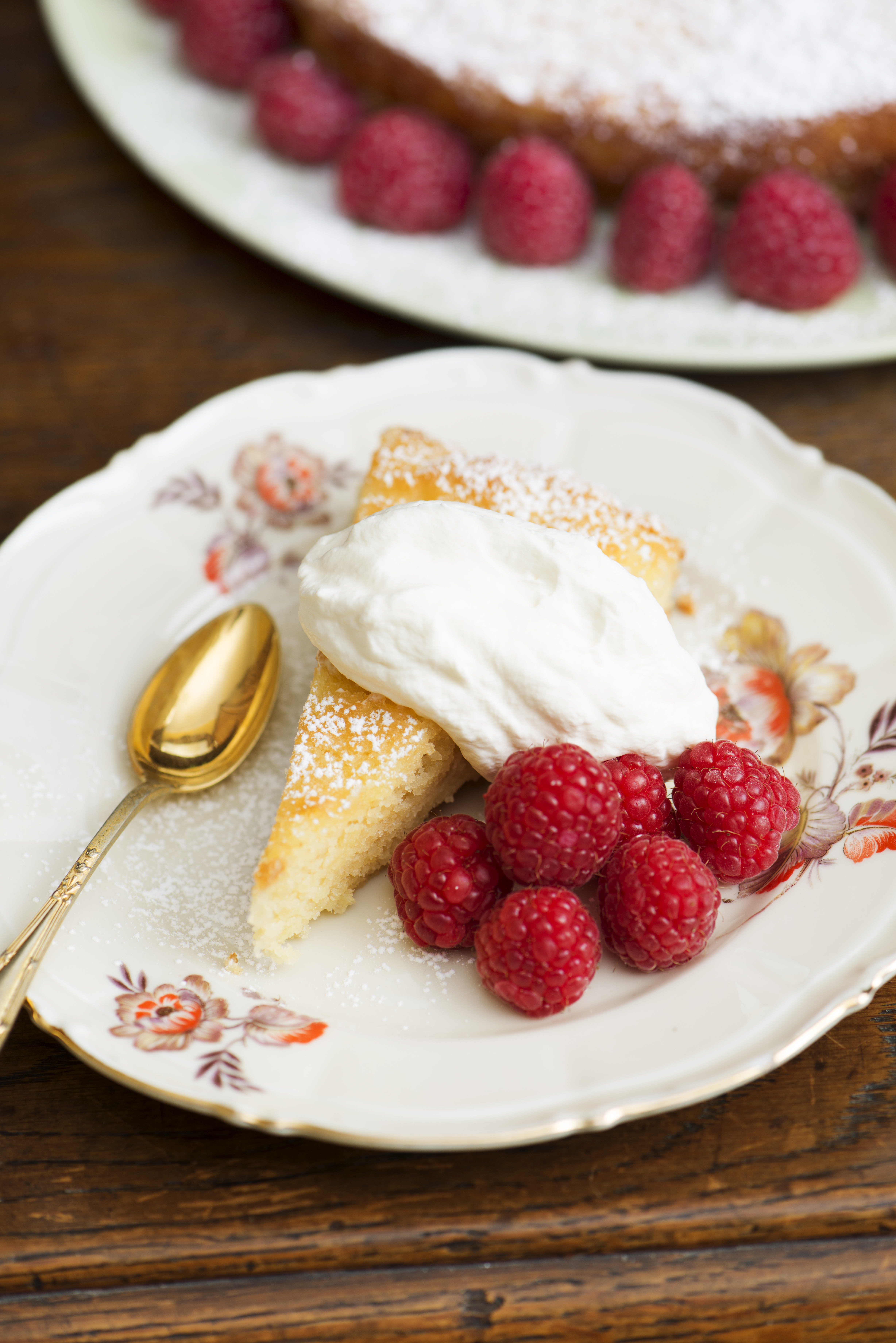 4. Grädda ca 45 minuter längst ner i ugnen. Låt svalna och pudra kakan med florsocker. Servera med vispad grädde och bär.