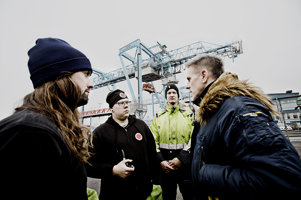 Hamnarbetarförbundet beskriver ett allt sämre samarbete med arbetsgivaren. – Vi såg vartåt det blåste redan 2015, säger Hamnfyrans ordförande Peter Annerback (till höger), här i samspråk med Martin Englund, Victor Carlsson och Niclas Ohlsson. Foto: Tomas Ohlsson (klicka på bilden för att se den större)