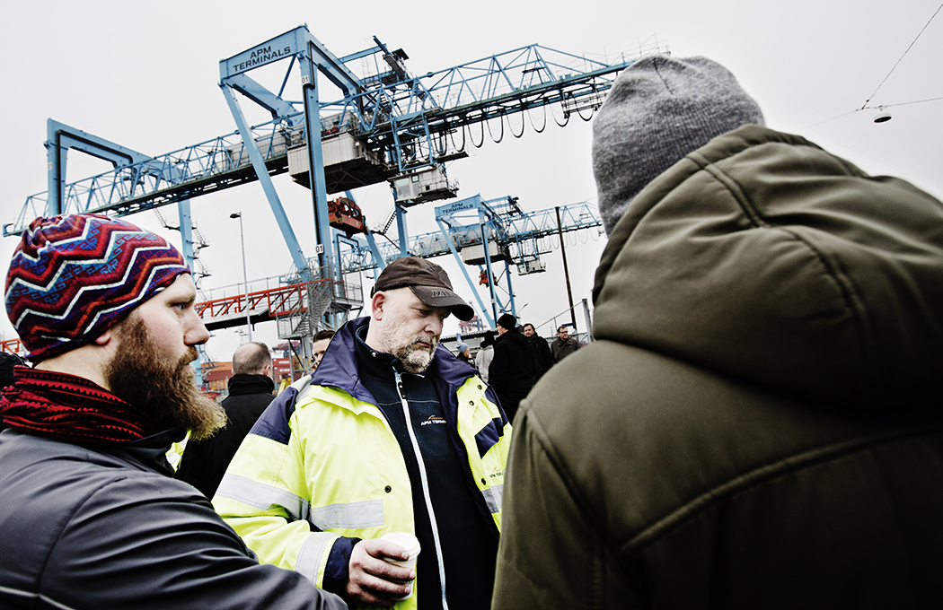 Aktiviteten i hamnen har stannat av, förutom i verkstaden där två gränsletruckar just rullar in. I verkstaden är de flesta med i Transport, men i övriga hamnen är 85 procent av arbetarna med i Hamnarbetarförbundet.