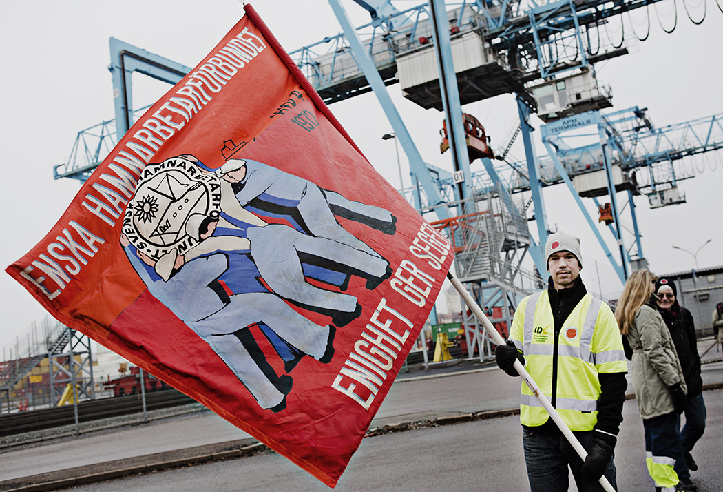 Robert Karlsson flaggade för att stödja strejken i Skandiahamnen i Göteborg. Foto: Tomas Ohlsson (klicka på bilden för att se den större)
