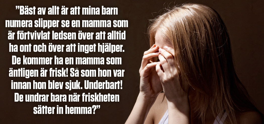 De ska äntligen kunna sitta vid sina datorer i stället för att tvingas hjälpa mamma bära hem matkassar. Något hon inte klarar själv. Och som gör henne sängliggande efteråt. De gläds åt att mamma äntligen kommer kunna följa med på deras aktiviteter. Bio kanske till och med? Eller en tävling de deltar i. Något som mamma gråtit många tårar över att inte kunna. Smärtan, att inte kunna sitta och utmattningen tog ju över. Numera kommer hon slippa känna sig som en kass och värdelös mamma. Så när?”