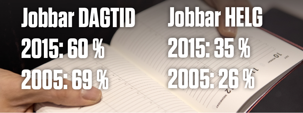 Statistik från Arbetsmiljöverket och SCB visar att kvälls- och helgarbete har ökat. 2005 svarade 69 procent i den återkommande arbetsmiljöundersökningen att de enbart jobbade dagtid, tio år senare var andelen 60 procent. Samtidigt steg andelen som uppger att helgarbete förekommer från 26 till 35 procent.