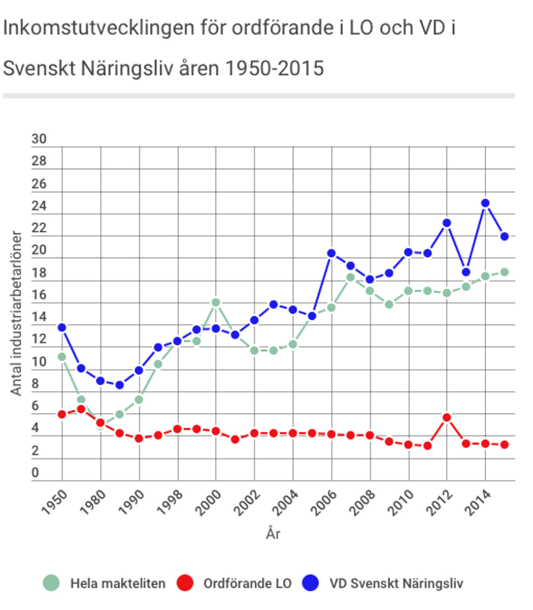 Undersökningen visar tydligt att det främst är den ekonomiska eliten som drar ifrån (den representeras av 50 verkställande direktörer på svenska storföretag, fördelade på sju branscher). År 2015 hade direktörerna i snitt 54,3 industriarbetarlöner – också det den högsta noteringen sedan år 1950. Notera att rapportförfattarna har satt ett tak vid direktörsinkomster som är högre än 200 industriarbetarlöner: Högre inkomster än så räknas inte med, för att inte ett fåtal extrema inkomster ska förvanska bilden.