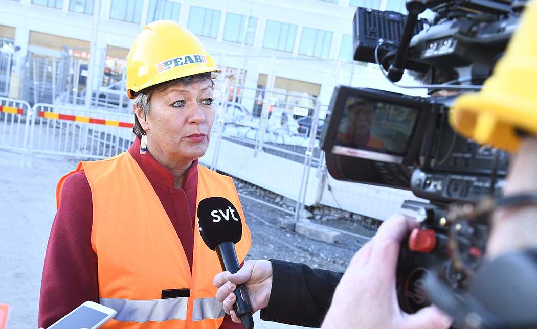 – Det är ju fortfarande en skillnad mellan lika lön och minimilön förstås. Det är en oacceptabel skillnad, det är därför vi vill ändra i direktivet, säger Ylva Johansson när pressträffen flyttat ut intill bygget och alla fått på sig likadana orangea västar som männen som snitslade vägen.