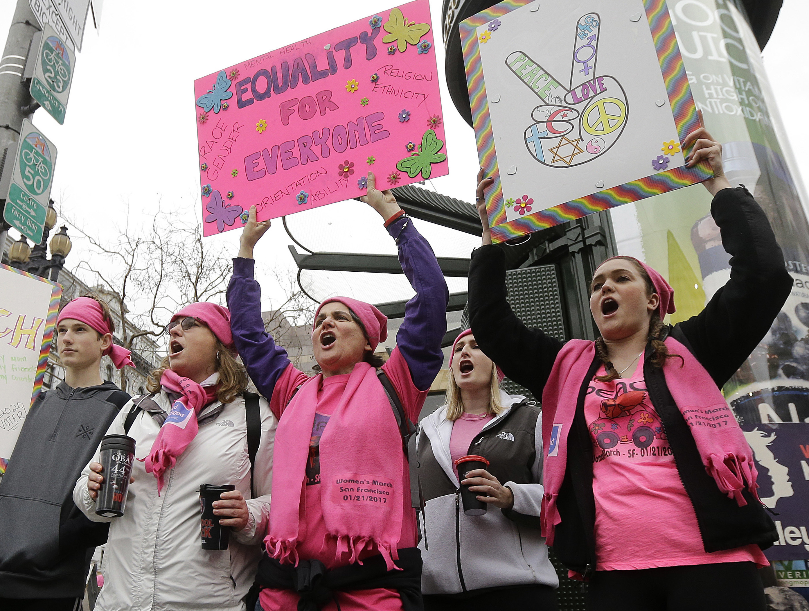 A group of protesters hold signs before a women's march during the first full day of Donald Trump's presidency in San Francisco, Saturday, Jan. 21, 2017. (AP Photo/Jeff Chiu)