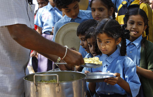 A girl looks at food served to her for free at a government-run school in Bangalore, India, Wednesday, Jan. 11, 2012. UNICEF's latest data say one-third of the world's malnourished children younger than 3 lives in India, a rate worse than sub-Saharan Africa. Indian Prime Minister Manmohan Singh has called child malnutrition the country's shame. (AP Photo/Aijaz Rahi)