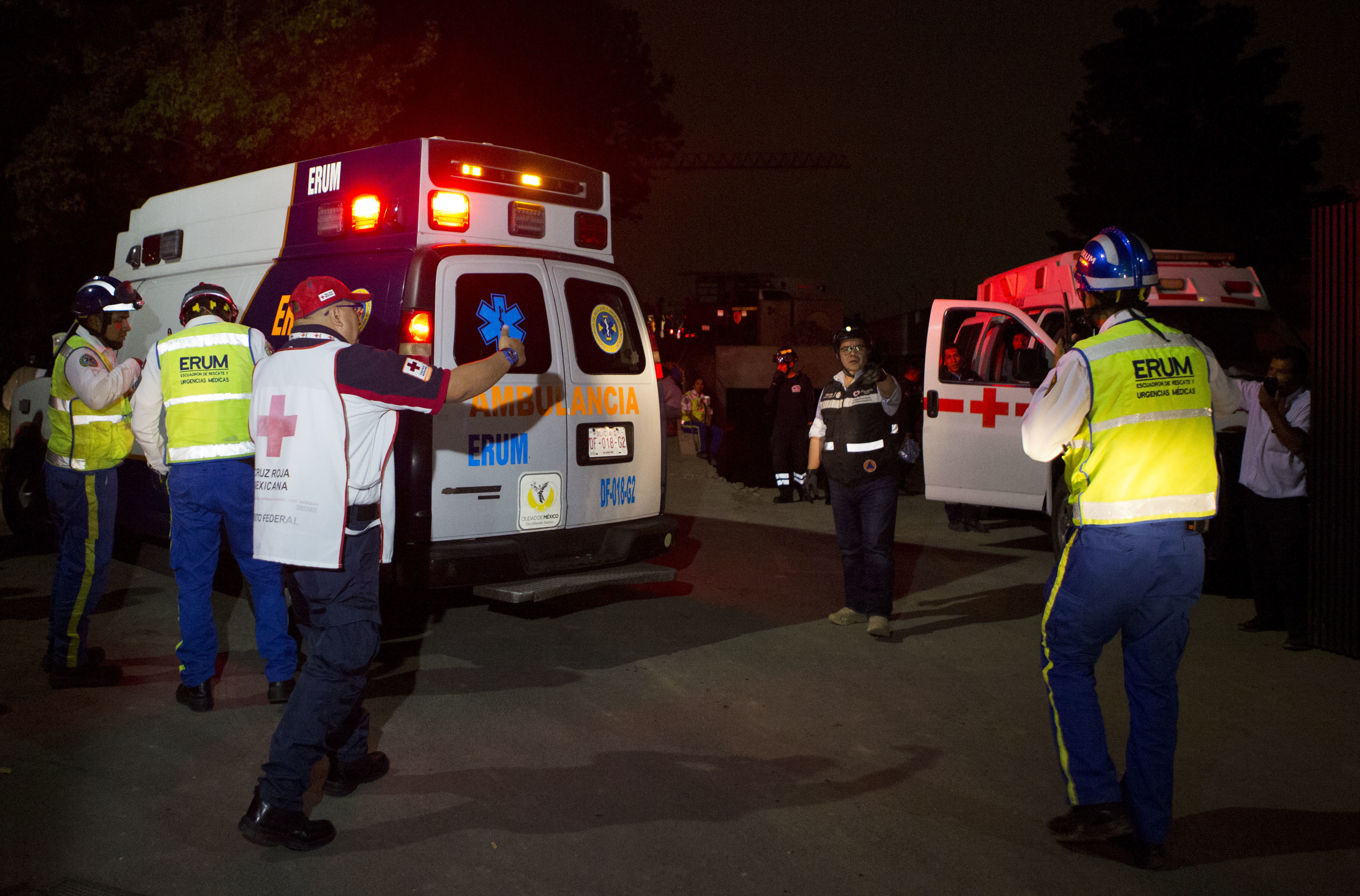 Bilder i mexikanska medier visar hur brandmän och ambulanspersonal arbetar för att får fram de instängda arbetarna ur bråten, som består av stora betongplattor.