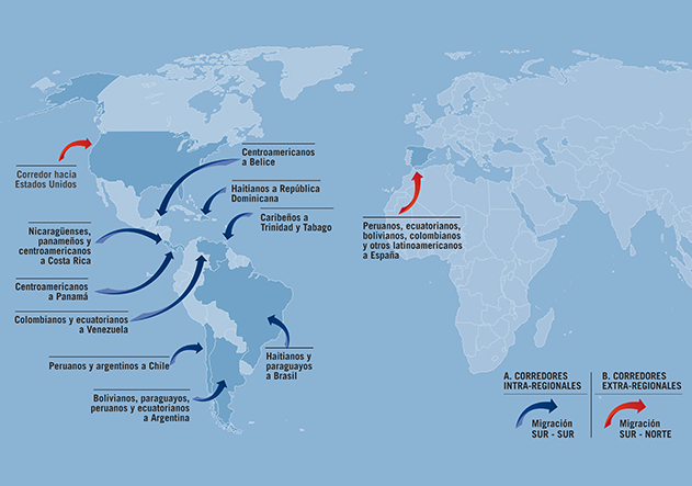 The study “Labour migration in Latin America and the Caribbean,” released in August 2016 by the International Labour Organisation (ILO), identifies 11 main migration corridors used by workers throughout this region, including nine intra-regional, South-South corridors that connect countries in the region, and two extra-regional South-North corridors connecting with the United States and Spain.