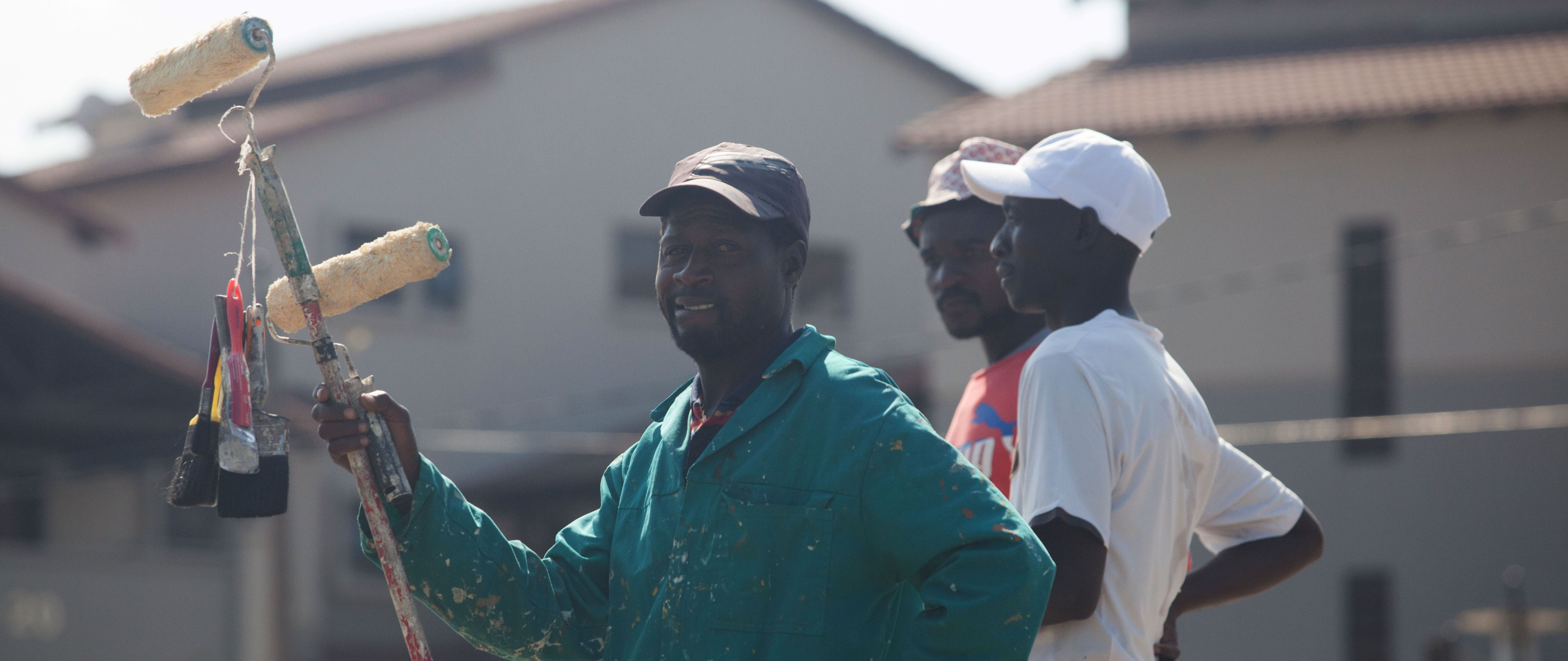 På andra sidan Johannesburg, utanför ett gigantiskt byggvaruhus, står Canisio Mudana tillsammans med ett gäng andra och ber om jobb.