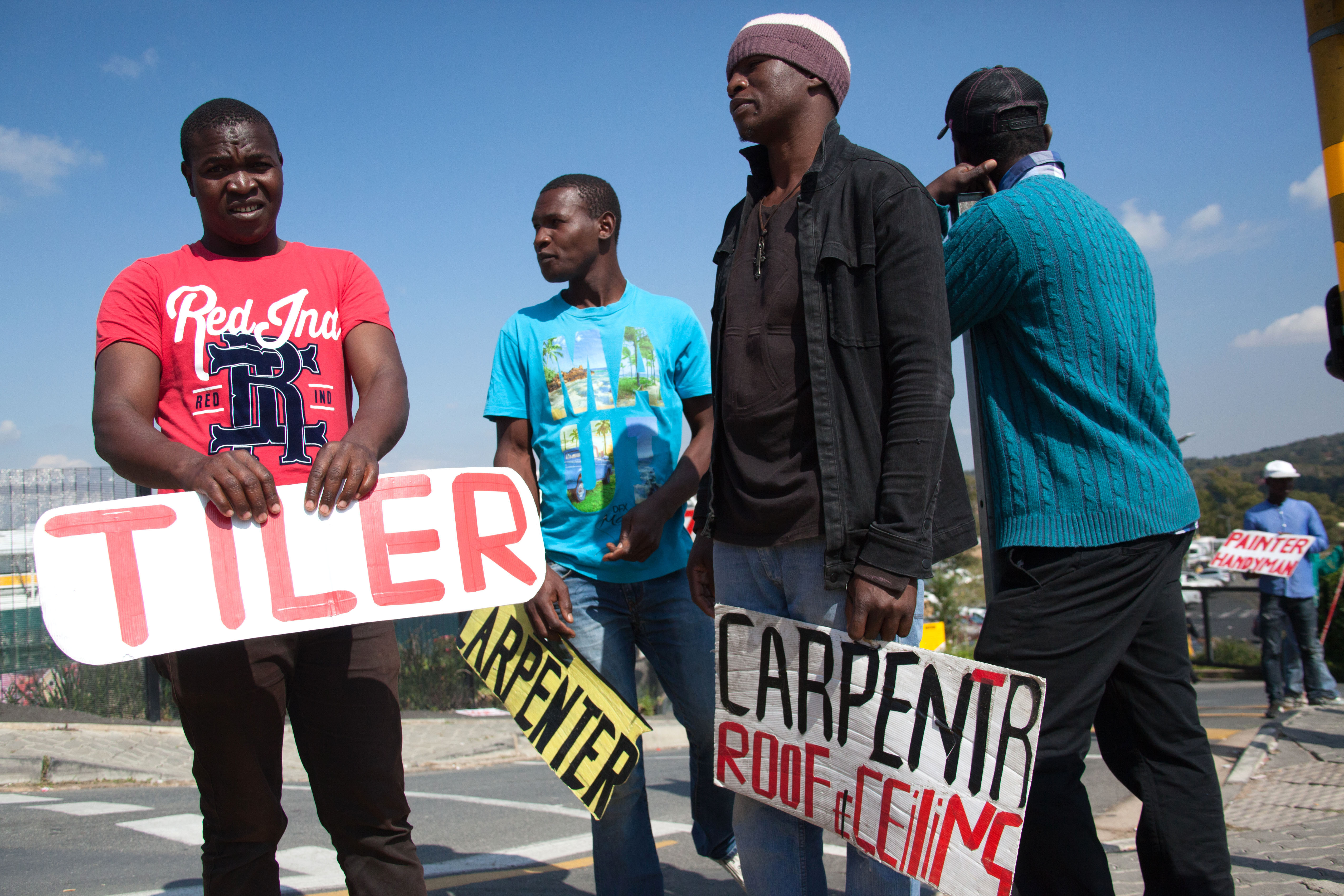 Det är först till kvarn som gäller. Därför börjar kön oftast redan klockan fyra på morgonen här i stadsdelen Isando i Johannesburg. Företag som behöver förare, byggjobbare eller kanske hjälp med packning och städning hör av sig under morgonen och jobb delas ut.
