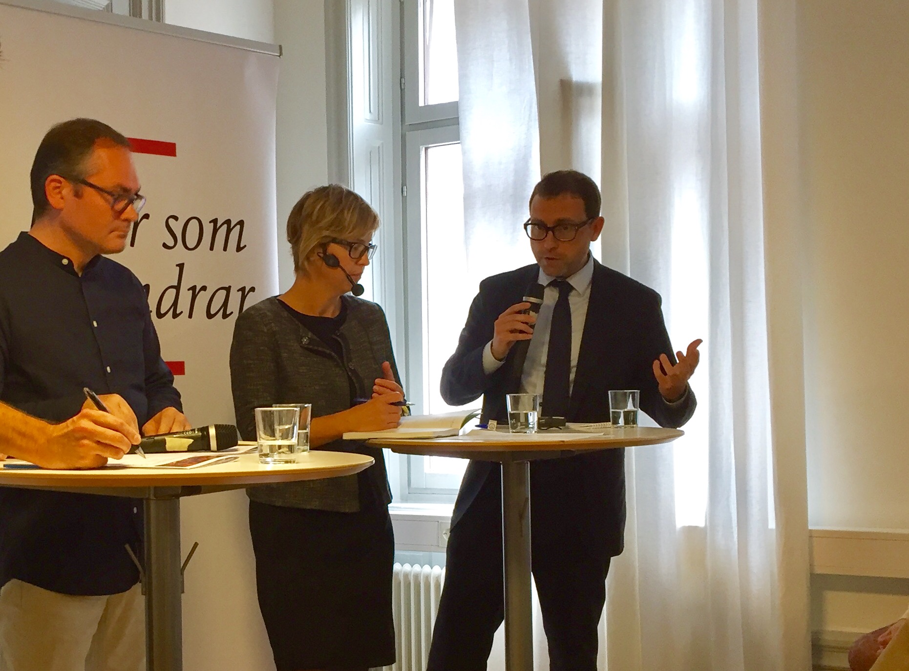 Fr vänster: Josep Costa, professor i statsvetenskap, samtalar med Lisa Pelling, utredningschef Arena Idé, och Albert Royo, generalsekreterare på Diplocat.