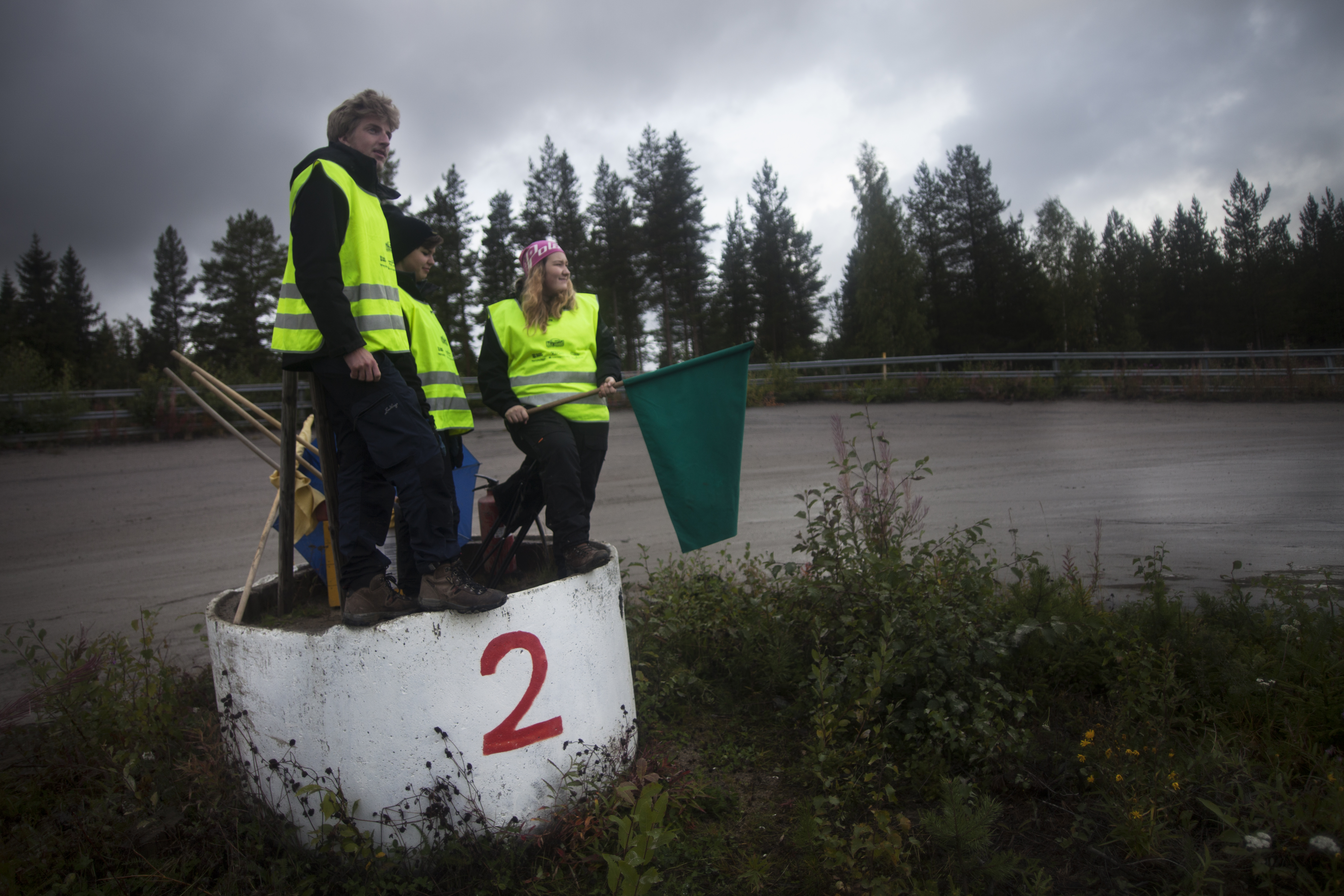 Henrik Folkesson, Emelie Eriksson och Maja Rönnkvist flaggar för att banan är redo för nästa heat. Emelie skulle själv ha kört men just i dag var hennes bil bortom räddning. Foto: André Larsson