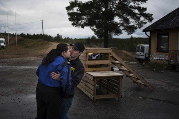 Alexandra Nilsson har precis åkt ur tävlingen efter att hennes bil havererade på sista varvet. Pojkvännen Andreas Karlsson tröstar. Foto: André Larsson