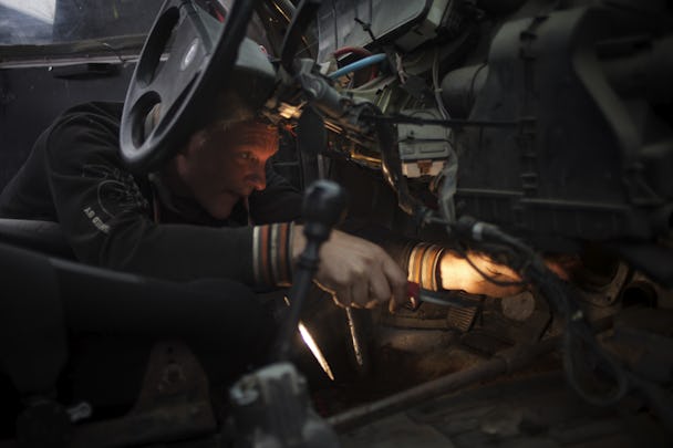 Johnny Berggren undersöker vad som är fel med en av familjens tävlingsbilar. Hela familjen och ett par kusiner är här för att både tävla och arbeta som funktionärer. Hela morgonen går åt till att fixa bilen men när hustrun Therese väl ska köra till startlinjen hoppar drivaxeln av och Therese tvingas bryta tävlingen. Foto: André Larsson