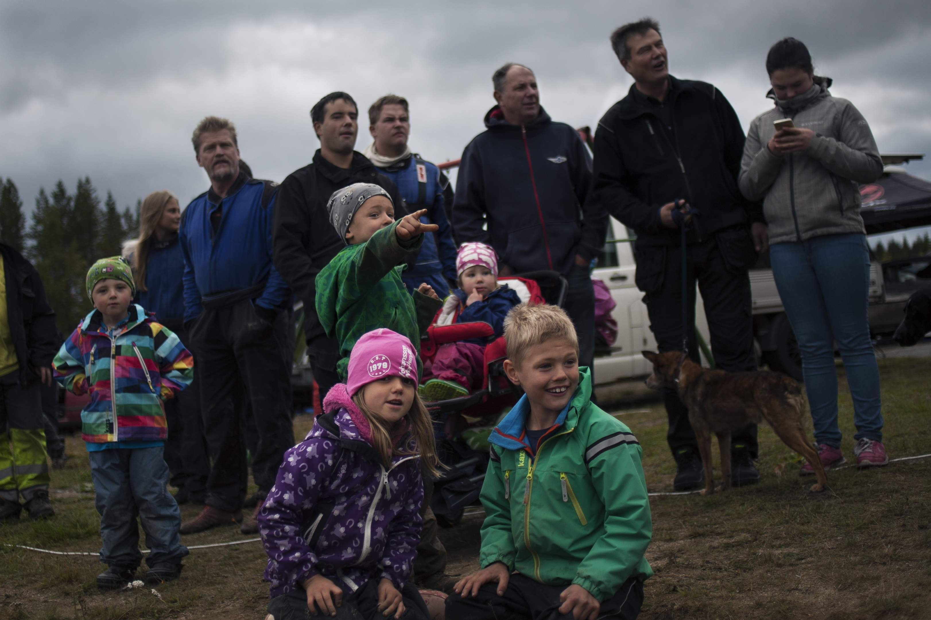 Runt hundra personer dyker trots ruggigt väder upp för att se de 52 tävlande. Erik, Lina och Rickard hejar på sina föräldrar som tävlar. Foto: André Larsson