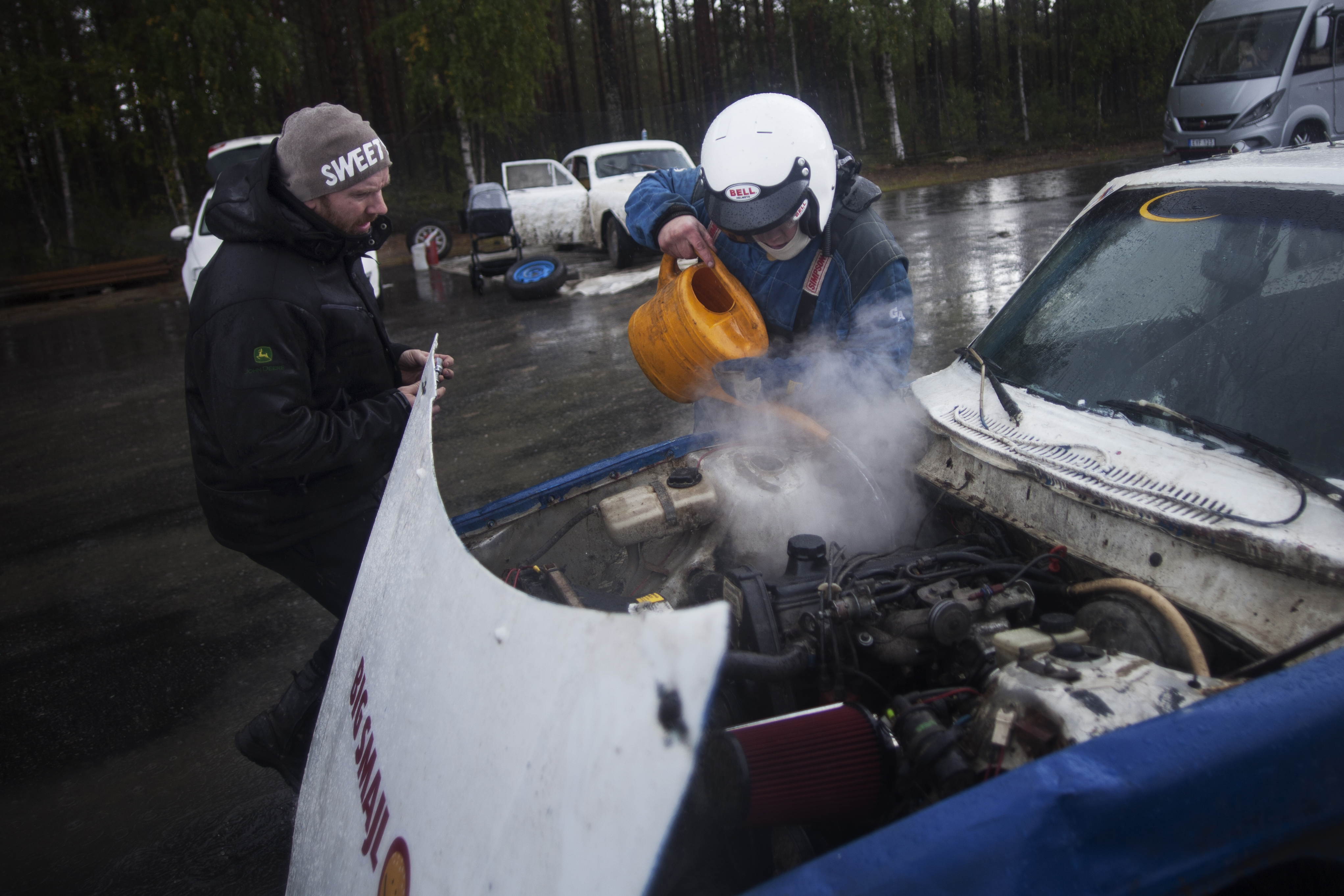 Jonas Lindgren hade redan börjat köra mot startlinjen men stoppas av funktionärer. Starten går om två minuter men Jonas får inte tävla om han inte innan dess hinner byta tändstift. Snabbt måste han kyla snabbt ner motorn med vatten för att komma åt tändstiftet. Foto: André Larsson