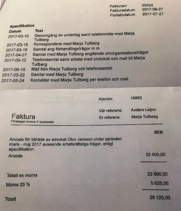 Under förhandlingarna om omorganisation har ordföranden Marja Tullberg biträtts flitigt av Lindahls advokatbyrå i Uppsala.