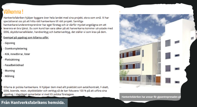 Förra året låg omsättningen på 28 miljoner kronor, antalet anställda var noll. De som arbetat på bolagets entreprenader har varit polska företagare. Byggnads har hävdat att arbetarna borde betraktas som anställda på Hantverksfabriken.