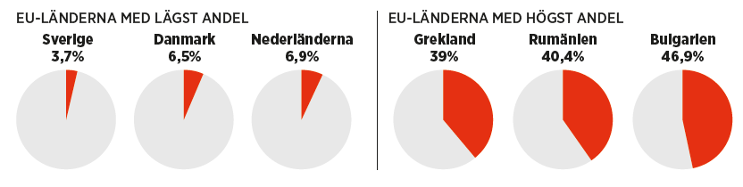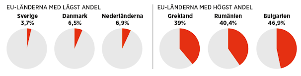 I Rumänien riskerar nästan var femte sysselsatt att bli fattig, i Sverige är motsvarande siffra runt sju av hundra. I Rumänien lever två av fem i materiell fattigdom, i Sverige är det ungefär fyra av hundra som gör det.
