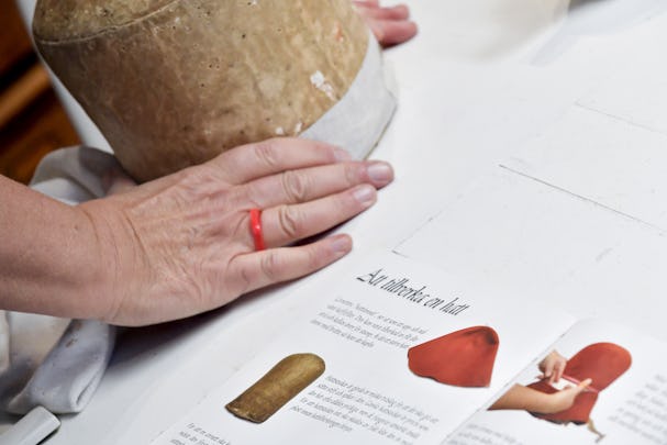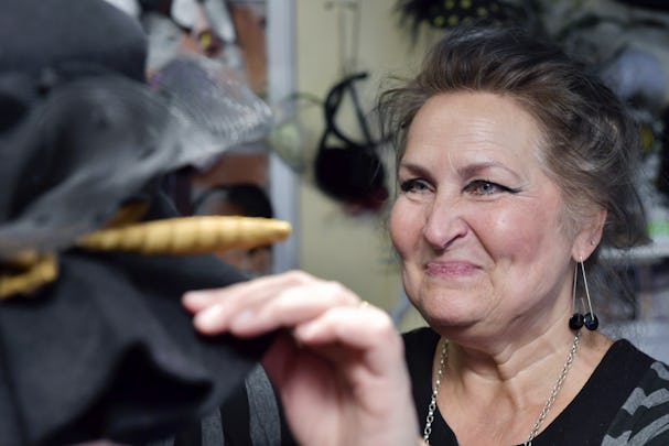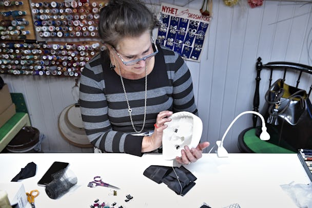 Hon har lärt sig modistyrket av totalt sju damer, som hon säger, men aldrig tagit ut gesällbrev. Hon vet vad hon kan ändå.