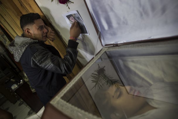 Rudy Fonseca, 29, gråter framför kistan där hans syster Kimberly Dayana Fonseca, 19, ligger död. Hon sköts till döds under demonstrationer som stöttar oppositionen i landet. Ett dussintal har dött i upplopp efter valet.