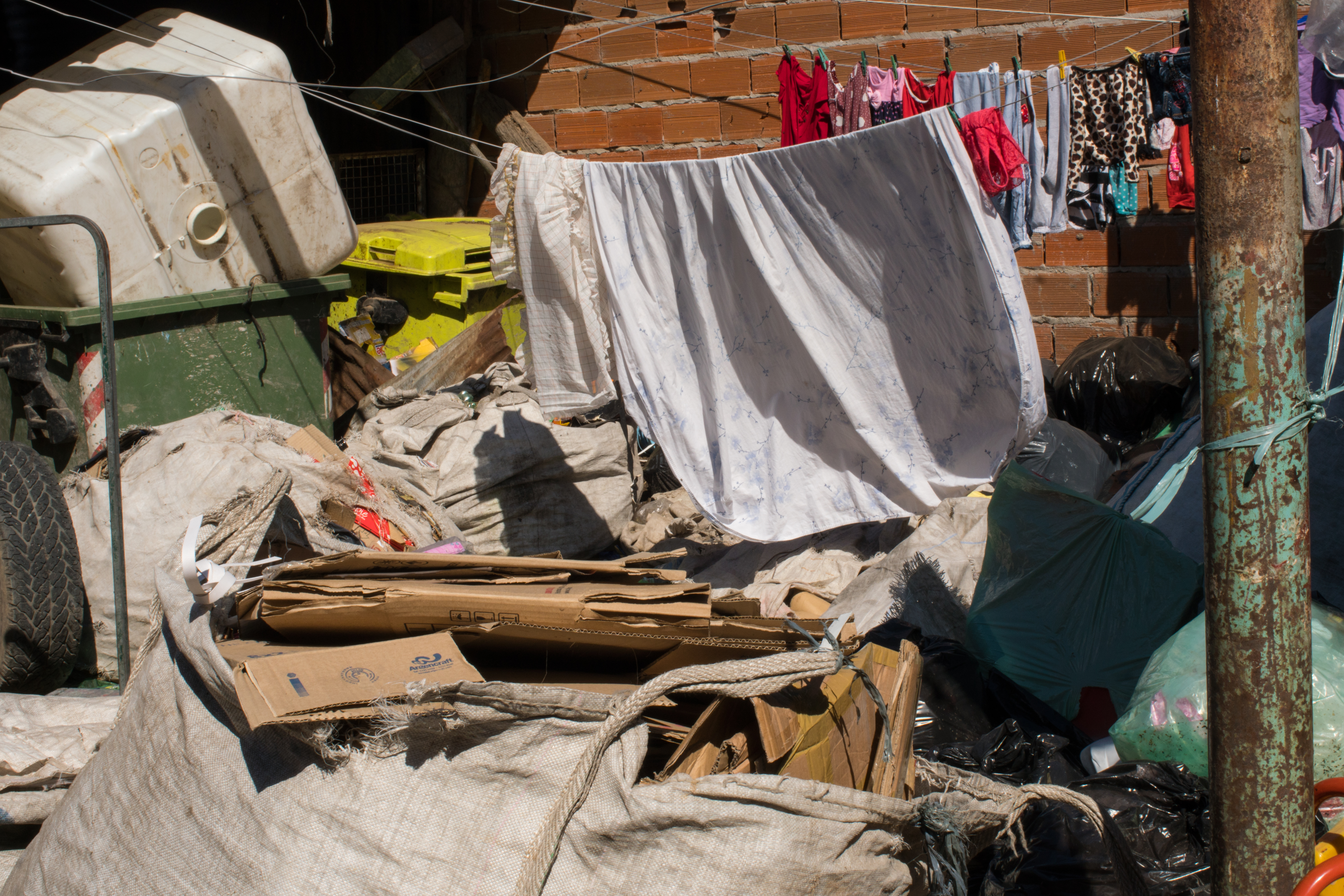 Byggsäckar med plast, kartong och glas tar upp större delen av utrymmet under tvättlinorna, mellan matbordet och kaninburarna. Några av hennes barn och barnbarn rusar runt bland säckarna.