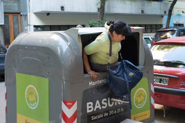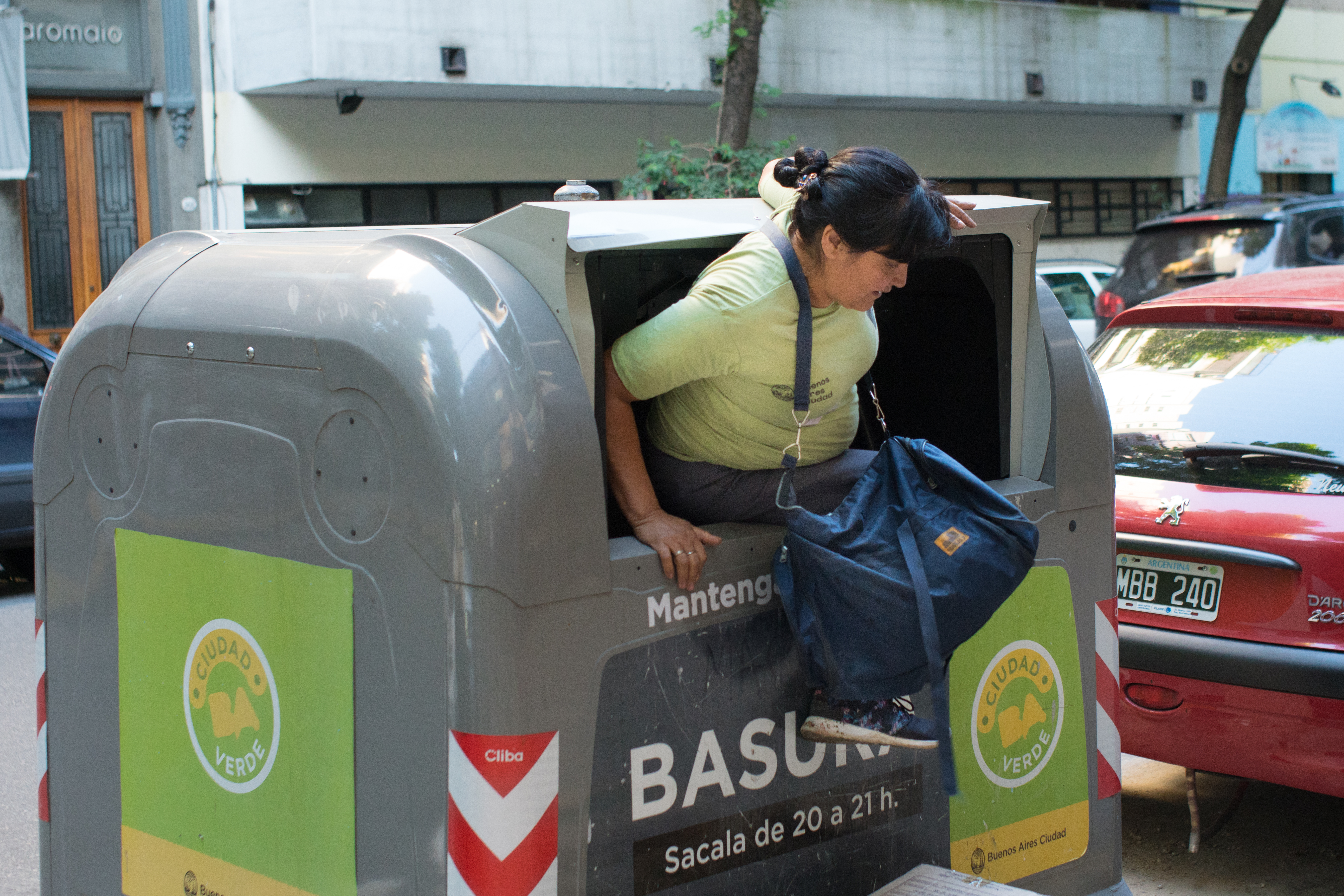 ARGENTINA Marcela Martinez skjuter upp sopcontainerns gummigardin, häver sig upp i det fyrkantiga hålet och hoppar i.