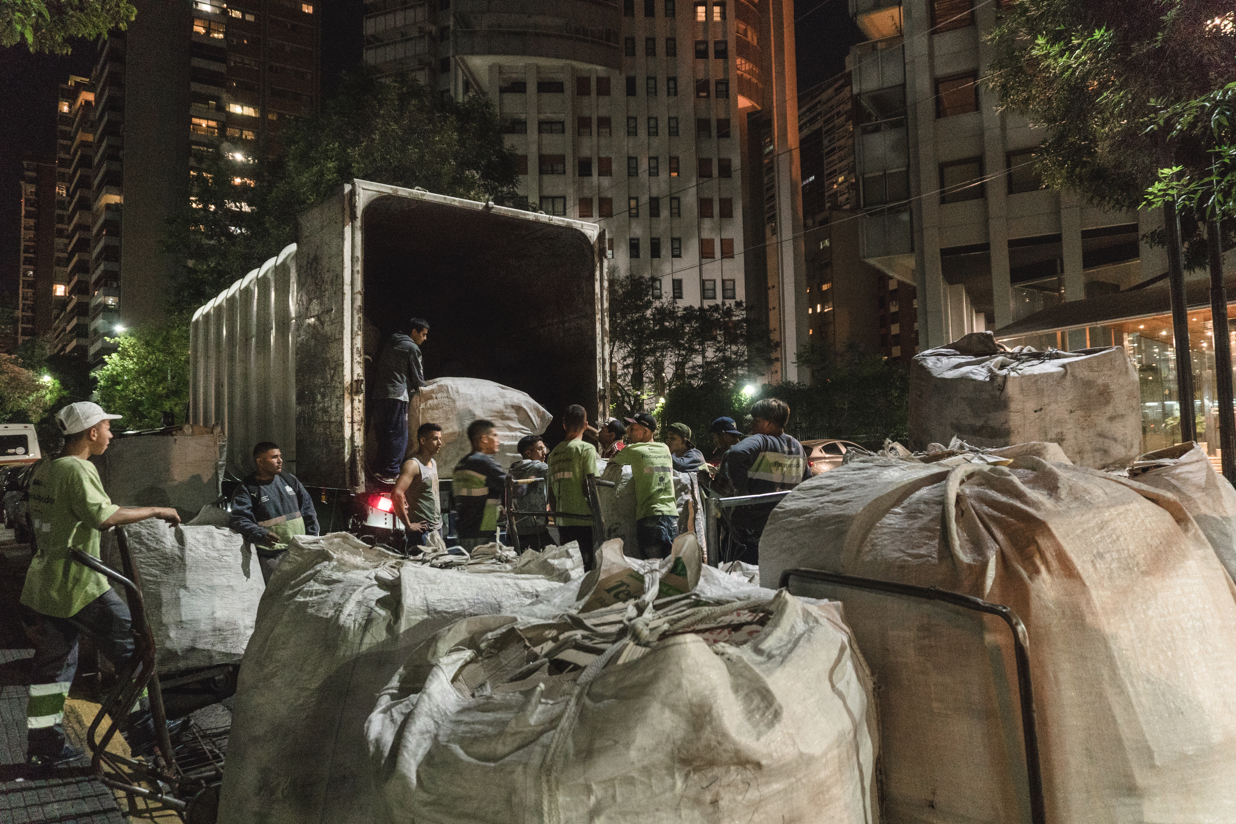 Återvinnarna kör sina fulla säckar till en samlingsplats där de lyfter upp dem på en lastbil och stiger på en buss. Säckarna känns igen på hur de är knutna och lastas av hemma hos var och en i Fiorito, ett fattigt område en och en halv timme från centrum.