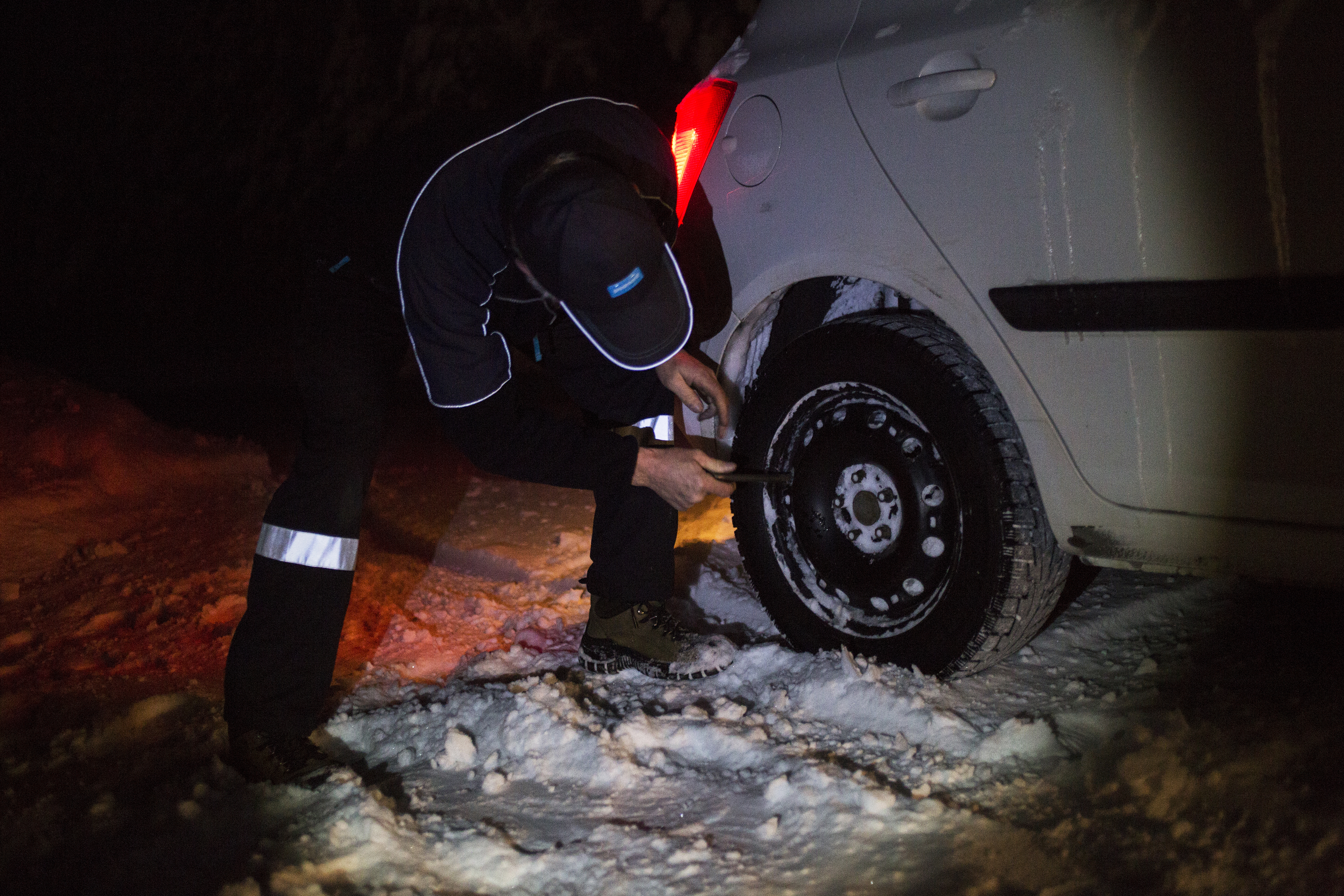 Snön ligger tjock och sätter sig i fälgen vilket får bilens styrning i obalans. Då och då får Kennet Kärrman banka bort snön med en hjulmutternyckel. Vissa nätter har det varit ner mot minus fyrtio grader. Då är bilsäkerheten högsta prioritet för ensamarbetare i Västerbottens inland.
