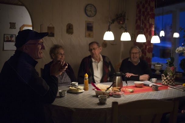 Dags för frukost nummer två hemma hos från vänster Vilma, Sven-Evan och Sven-Allan Dahlgren (samt Siv Jakobsson utanför bild). Ute i byarna har Kennet efter alla år som tidningsbud lärt känna människor som bjuder på frukost, hjälper till med bensin när det krisar eller vad helst som kan behövas.